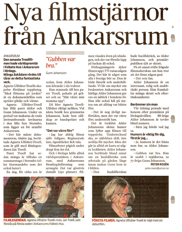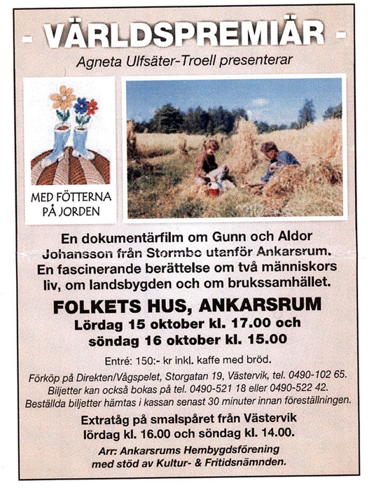 Premiären i Ankarsrum den 17 oktober 2011 blev en succé. Den största lyckan för mig, min familj och Olle var och är att Aldor och Gunn var glada över filmen och att Aldor som då var svårt sjuk hann att se filmen om sitt liv och säga att det var något av det bästa som hänt ! Sedan följde flera lyckade föreställningar i Ankarsrums Hembygdsförenings regi.
