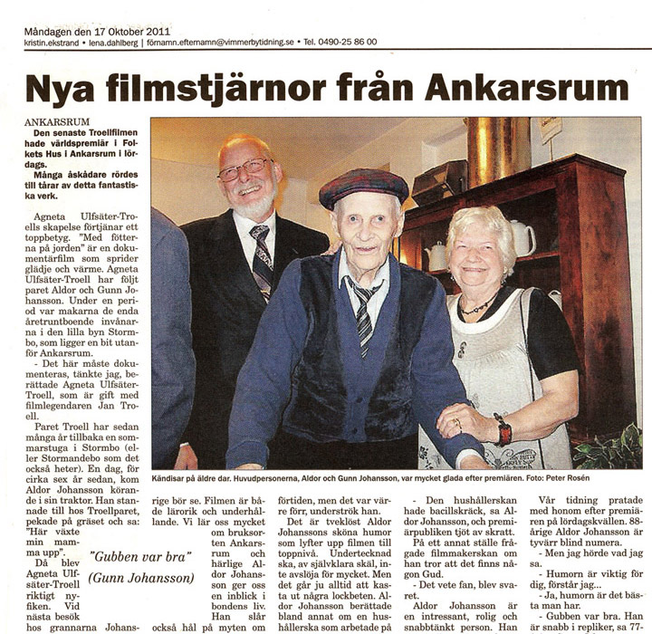 Aldor Johansson, den siste brukande bonden i Stormbo gick ur tiden i maj 2012. I den röda stugan i byn Stormbo, där generationer av arrenderande bönder bott, bor nya ägare. Huset är idag modernt renoverat. Aldors Gunn bor i en lägenhet i Ankarsrum. Idag hade filmen ”Med fötterna på jorden” varit ett helt omöjligt projekt. Ofta tänker jag: Tack och lov att jag hann!