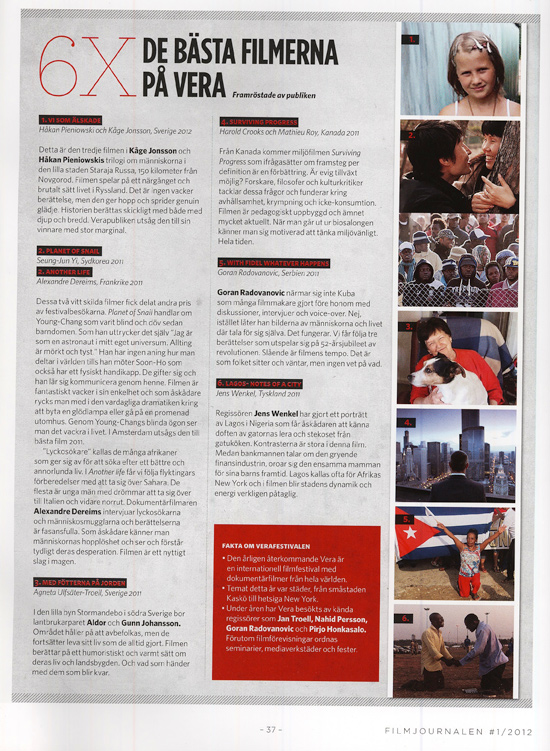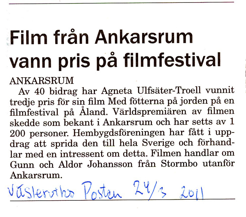 Och vilken film hamnade på 3:e plats på Filmfestivalen VERA på Åland våren 2012? Om inte ”Med fötterna på jorden”.